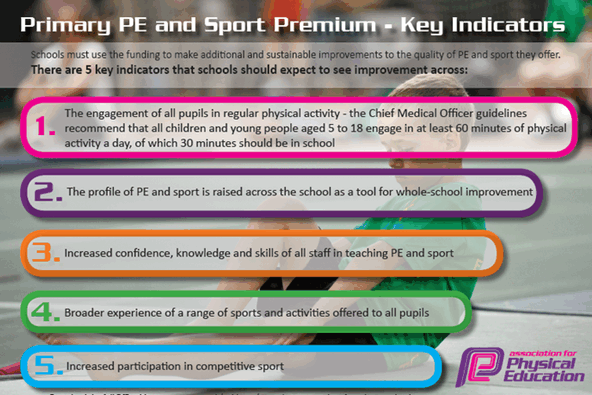 government funding for sport. Schools must spend the funding to improve the quality of the PE and sport activities they offer their pupils, guided by the 5 Key Indicators shown.